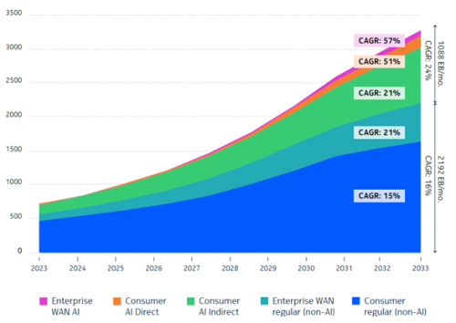 According to Bell Labs Global Network Traffic report, wide area network (WAN) traffic is forecast to reach 3,386 exabytes per month by 2033. A substantial portion of this (1,088 exabytes) is attributed to AI traffic alone, which is projected to grow at a compound annual growth rate (CAGR) of 24 percent (Figure 2).